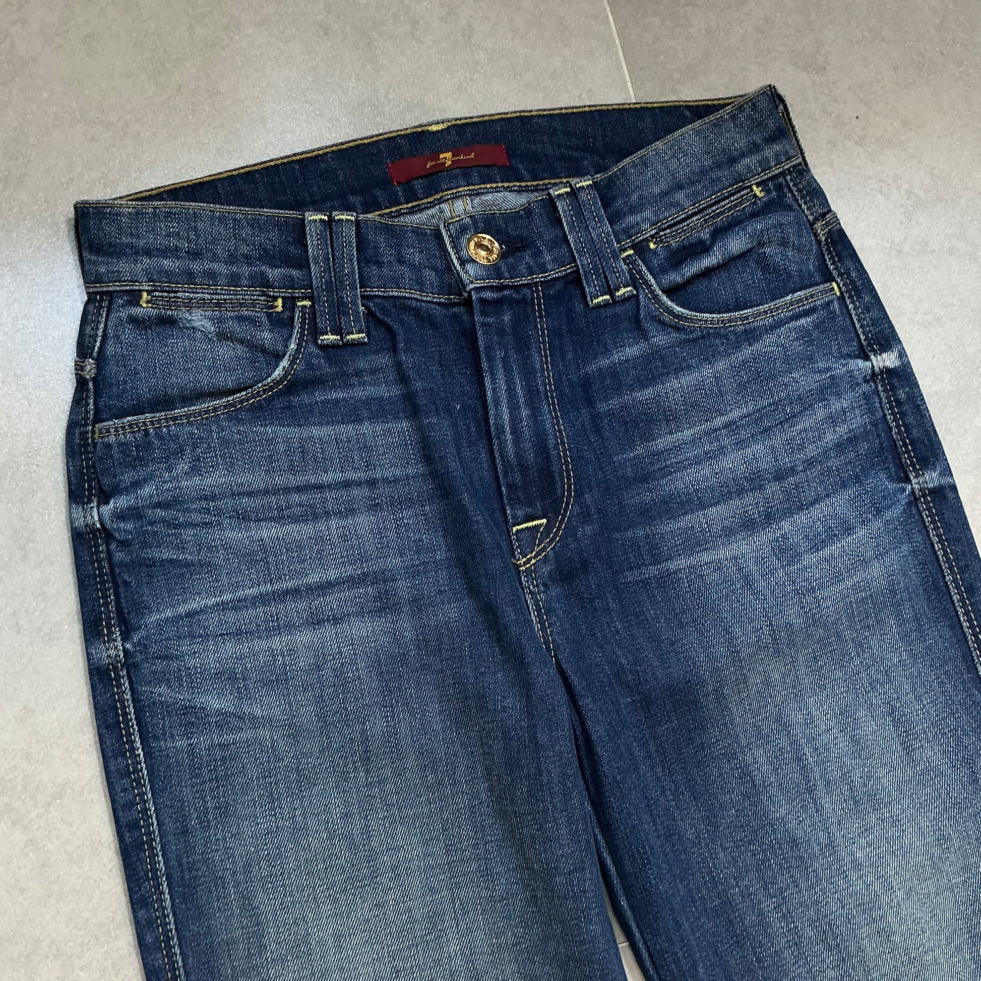Details: low-rise fit, bold flared legs, and signature back pockets with subtle detailing. Made of premium denim, dark wash with authentic fading and whiskering